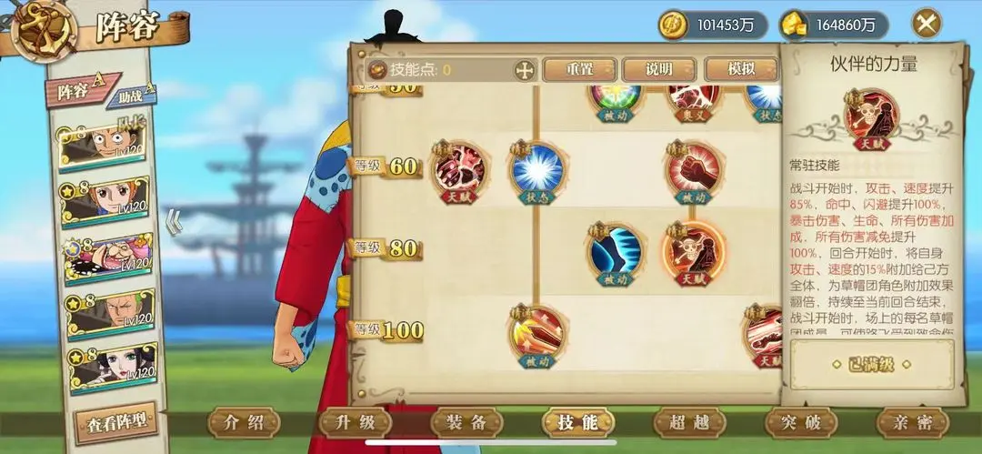 己方所有草帽团角色速度提升40%,为己方其他草帽团角色分摊80%伤害,索隆辅助与肉坦的当担位置。