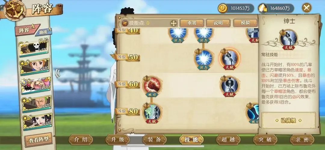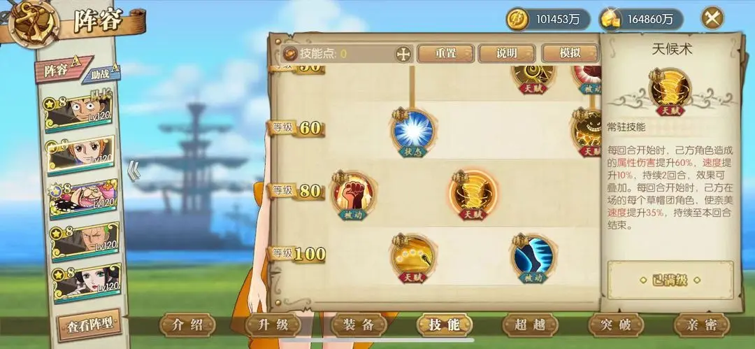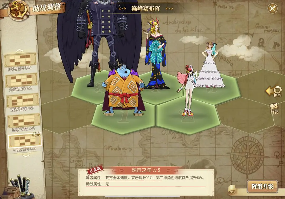 己方草帽团角色速度、暴击、闪避提升50%,速度提升高。