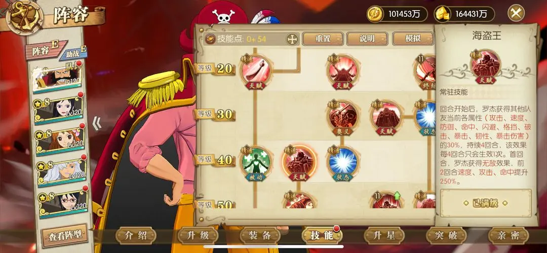 己方全体速度、命中、破击提升40%,草帽团提升效果翻倍。罗宾为草帽提高生存与属性面板效果。