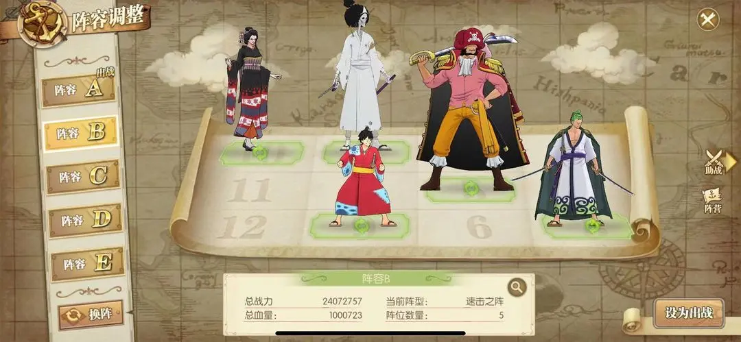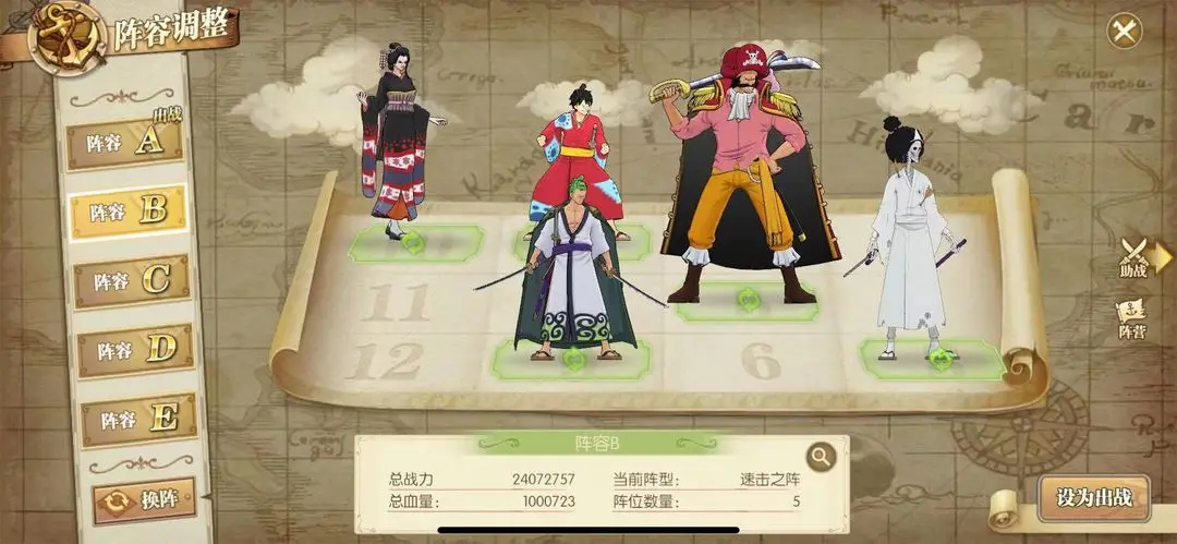 搭配全员草帽团核心是能不断地叠加草帽团的各项面板属性,让罗杰在吸取的过程中,能获得更多属性数值,让罗杰能更快的出手,天下武功,为快不破,全员草帽团为罗杰打辅助,当然搭配甚平上场也是可以的。助阵以加攻加速为主!