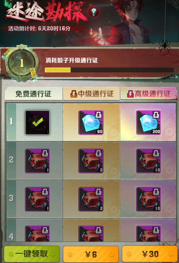 这个通行证6米和30米,就是消耗骰子提升等级。