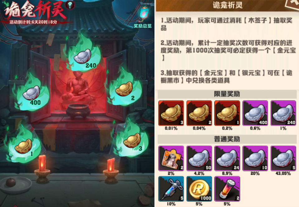 抽奖概率咋说呢?抽了100抽(6000钻),一共出了1800多银元宝,没出金。好不好大家自己衡量吧。