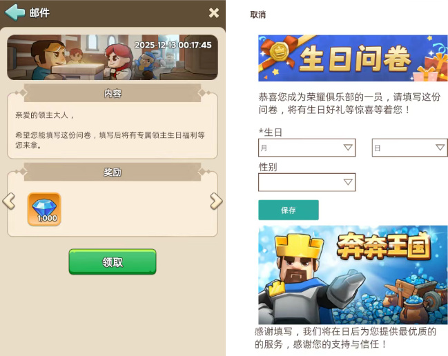 奔奔王国在游戏内给玩家们发送了一份生日问卷,大家填写完成之后,就能领取对应的生日礼物,奖励包括:钻石、体力、钥匙、头像框等等,这里带来生日问卷填写教程图文介绍,希望对各位有帮助。