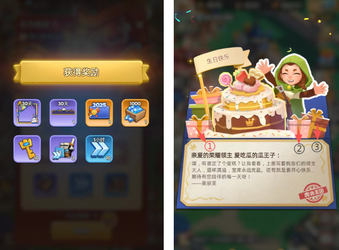 1.当玩家城镇中心达到30级或在游戏内充值积分累计达到50万后,系统将会发送一封生日问卷的邮件。